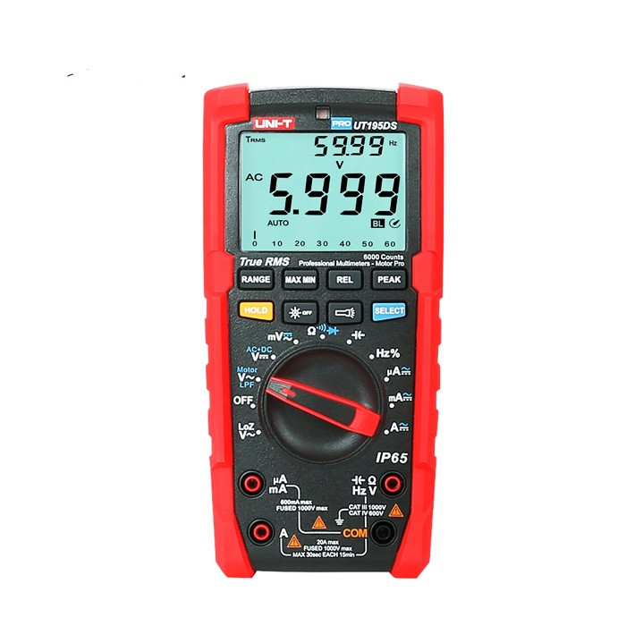 مولتی متر دیجیتال یونیتی UT195DS, برای اندازه گیری کمیت هایی از قبیل ولتاژ و جریان و مقاومت و انجام انواع تست ها نیاز به مولتی متر صنعتی و دیجیتال میباشد.. اکنون با افزایش تکنولوژی و همچنین با کاربردی تر شدن مولتی متر ها کمیت های دیگری از قبیل دما، تست خازن، تست دیود و دیگر تست ها از قبیل تست پایه های ترانزیستور به آپشنهای مولتی متر حرفه ای یونیتی اضافه شده است. مولتی متر UNI-T UT195DS محصول برند معتبر یونیتی هنگ کنگ که دارای بدنه قوی و ضد ضربه می باشد. دارای صفحه نمایش LCD با صفحه بزرگ ۶۰۰۰ رقمی می باشد. رنج اندازه گیری خوب در کمیت های ولتاژ AC و DC، محدوده کاری فرکانسی خوب، حالت های دو گانه و چند گانه تست و اندازه گیری توالی موتور با دو پراپ از ویژگی های بارز این مولتی متر ضد آب میباشد.