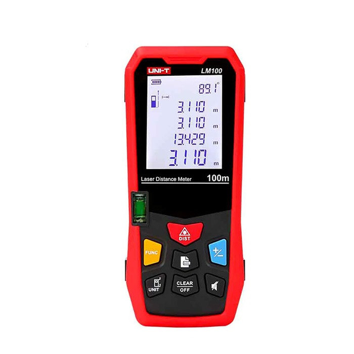 متر لیرزی یونیتی مدل LM100 نحوه عملکرد این دستگاه به گونه ای است که با استفاده از زمان رفت و برگشت یک پالس لیزر به هدف، می توان فاصله مورد نظر را اندازه گیری کرد. این وسیله نمونه ای از وسایل پرکاربرد می باشد و بسته به کاربرد آن از نمونه های مختلفی برخوردار می باشد. از لحاظ ظاهری این ابزار اندازه گیری سبک و کوچک است و فرد می تواند فقط با فشار دادن یک دکمه طول ، زاویه ، حجم ، سطح ، رابطه فیثاغورثی و ... اندازه گیری نماید.