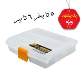 جنس بدنه پلاستیک خشک، قفل پلاستیکی و درپوش شفاف، دارای ۵ محفظه مناسب برای تفکیک اقلام و ابزار آلات کوچک نظیر پیچ و مهره و … از یکدیگر